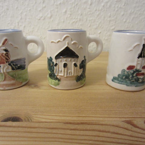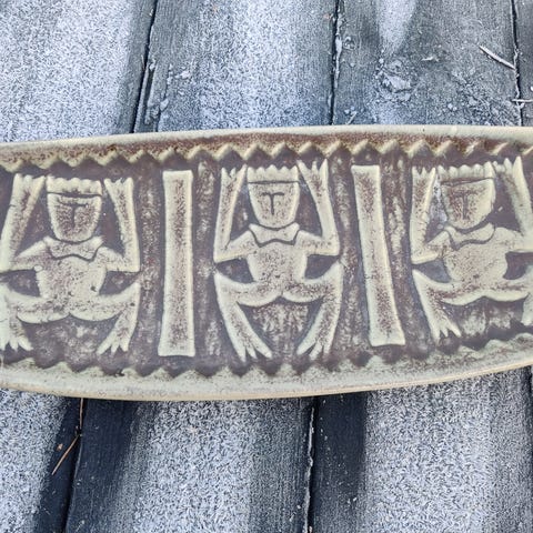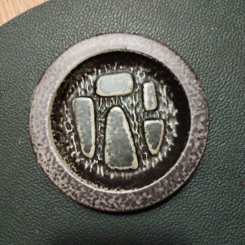 Johgus Bornholm keramik fade i sæt bestående af tre stykker. Fadene har en grå farve med dekorative mønstre og figurer. Materialet er keramik, og de har forskellige størrelser og former, herunder en rund, en rektangulær og en aflang form. Sættet kan anvendes til dekoration eller servering.