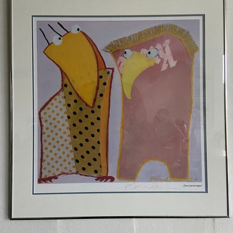 Smukt og livligt kunsttryk af den danske kunstner Karin Olesen, kendt for sine fantasifulde, farverige motiver og ekspressive figurer.