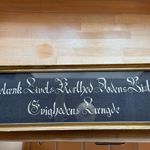 Korsstingsbroderi på plade: "Hafnia Metropolis Et Portus Celeberrimus Daniæ"