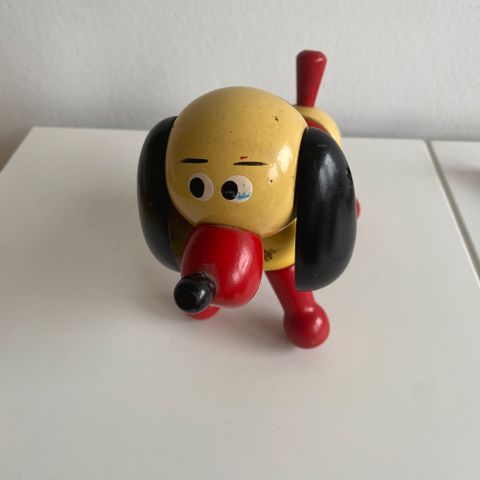 Trælegetøj formet som en sort hund med gule ører og røde hjul. Legetøjet har en snor til at trække den med. Materialet er træ, og designet er enkelt og farverigt.