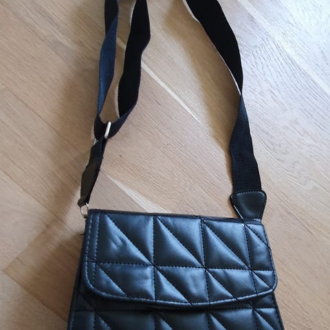 Fin håndtaske, som kan stå selv. En udvendig lomme, 3 indvendige.