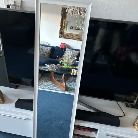Fint spejl - 40X101 cm. Ophæng til både lodret og vandret. Bagbeklædning repareret med tape. Hvid ramme i plastik.