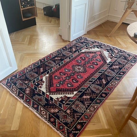 Der er brugsspor på tæppet efter sofabord/puf + en enkelt plet, det kan ses på billederne. Nypris 1900kr