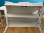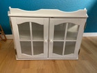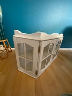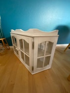 Hvidmalet væg vitrineskab med 2 hylder i og med sprosse glasruder i. I rigtig fin stand dog er der lidt brugsspor fra tidens løb men et rigtigt fint møbel.