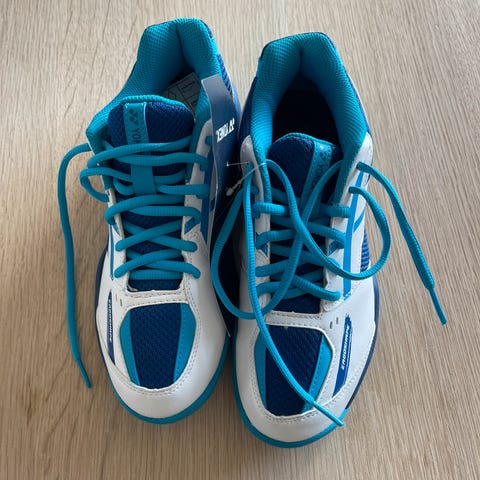Yonex Power Cushion 28 badmintonsko i størrelse 38. Materialet består af syntetisk læder og mesh, designet til indendørs sportsbrug, særligt badminton. Skoene har en let og støddæmpende sål med Yonex Power Cushion teknologi for forbedret komfort og støtte.