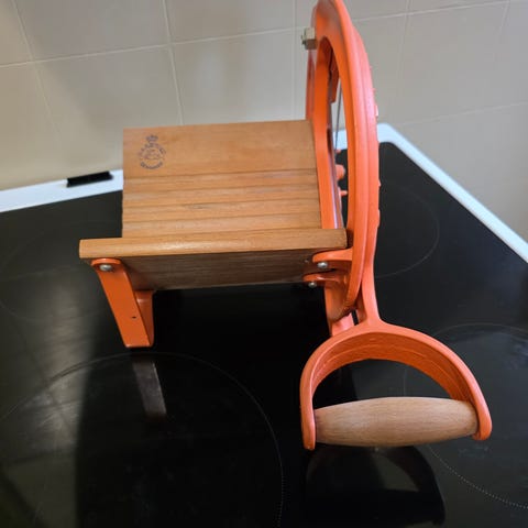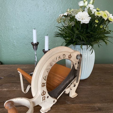 Skøn gammel Raadvad brødskærer. Cremefarvet, med ‘guldstaferinger’. Med charmerende patina. Super til opbevaring af kogebøger på køkkenbord.
