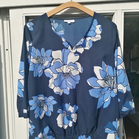 Bluse i blå farve, størrelse M. Blusen har et blomstermotiv foran og er lavet i et let og behageligt materiale med lange ærmer.