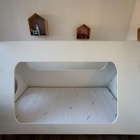 Det medfølger helt ny helsemadras samt sengerend aldrig anvendt og helt nye skuffer aldrig samlet står i emballage fortsat.