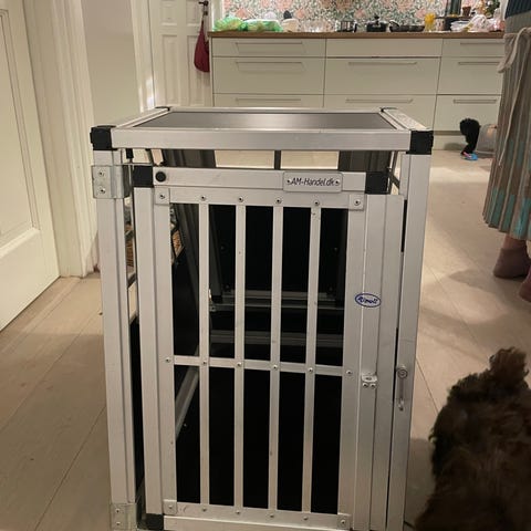 Doggy hundebur fremstillet i aluminium med sorte paneler. Buret har en gitterdør og sider, der sikrer ventilation og udsyn. Designet til at kunne bruges til transport eller opbevaring af hunde. Robust konstruktion med metalramme og sorte plader, som giver stabilitet og holdbarhed.
