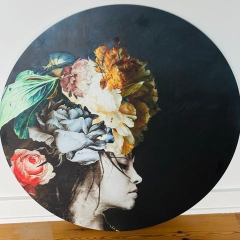 Circle Art Haute Couture Rundt Vægkunst med en diameter på 70 cm. Vægkunst med detaljeret blomsterdesign og portræt i flere farver på en mørk baggrund. Det er malet på en træramme. Købt i Ilva for kr. 999 pr. stk. (prisen sidder bagpå). Sælges for kr. 500 pr. stk.