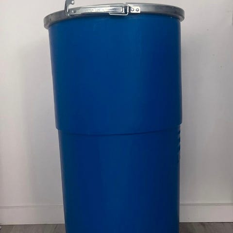 Sæt med blå plasttønder i forskellige størrelser fra cirka 60 til 220 liter. Tønderne er velegnede til opbevaring eller transport af foder, væsker og materialer. Materialet er robust plastik, og tønderne har låg med tætning. Har været brugt til opbevaring af korn. Farven er primært blå, med enkelte sorte tønder. 100 - 300kr.