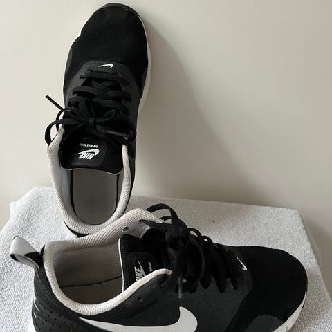 Nike air i farven sort, grå og sort. Skoene viser tegn på brug med slid på snørebånd og ydersål.