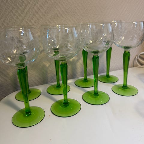 6 fine franske hvidvinsglas på grøn stilk.