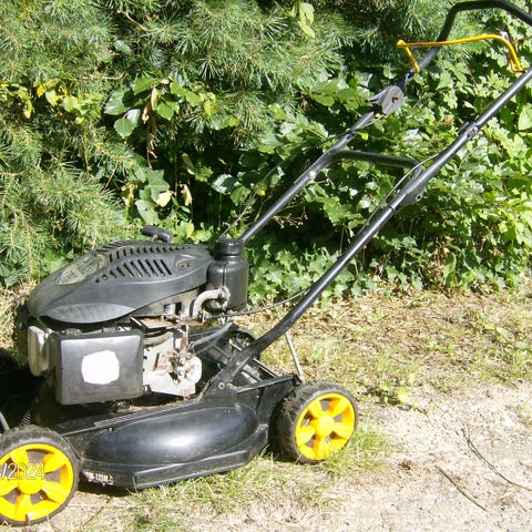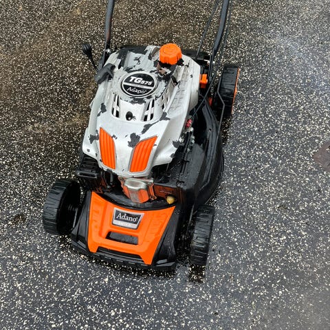 Selvkørende benzindrevet plæneklipper med kraftig motor.