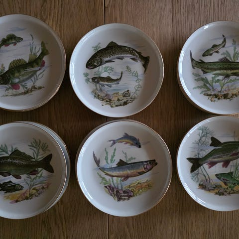 Colditz tallerkener med fiskemotiv, 12 stk i sæt. Tallerkenerne er dekoreret med forskellige fisk. Velegnet til servering og samling. 17 cm