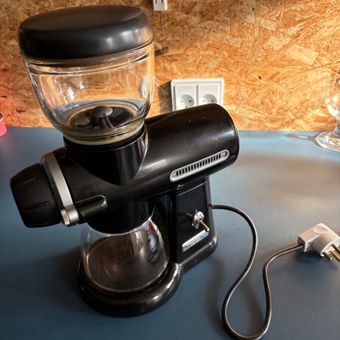Velfungerende, pæn og velholdt. God starter-kaffekværn med rigtige koniske rustfri kværne Glasbeholder til malet kaffe mangler.