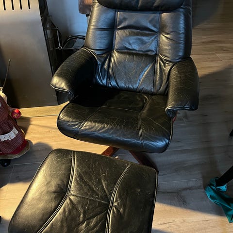 Brugt med brugs spor med vippebeslag 2 stole 2 skamler sort med blank fod læderstole man sidder godt i dem
