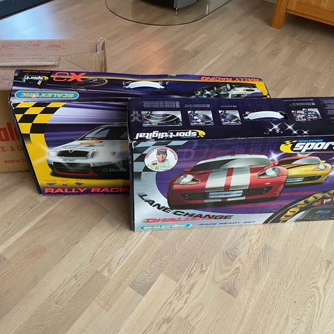 3 baner, sælges samlet. Der medfølger 6 biler. 3 af dem køre ikke særligt godt. Der er 2 ekstra joysticks.