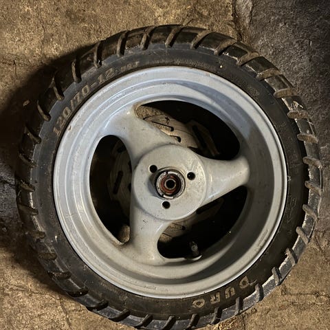 PGO hjul med Duro næsten nye dæk.120/70-12 56J med skive,og 2 stk Duro 130/70-12 58j .Prisen er pr.stk.eller 800kr.alle 3.