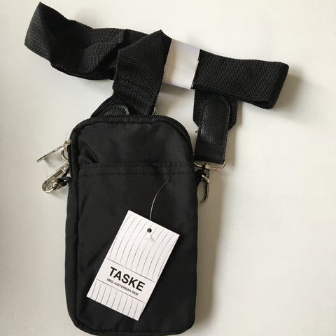 Ny moderne mobiltaske i sort nylon med kraftig indstilling rem, Ny mobiltaske i sort nylon og polyester med kraftig aftagelig rem. Rum til pung/kort. Størrelse 18 x 10 x 3 cm.