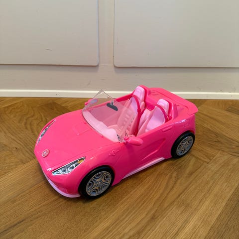 Barbie legetøjsbil designet til børn, i farverne lyserød og lilla. Bilen har en åben kabine med plads til dukker og er lavet af plastikmateriale. Egnet til leg og rollelege for børn.