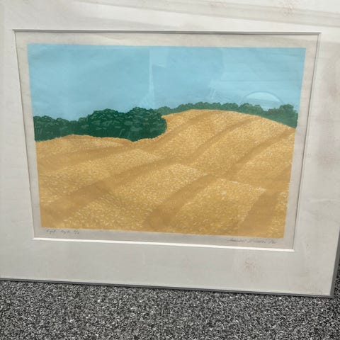 Maleriet er indrammet i en træramme og har en bagbeklædning med ophængningssnor. Farverne inkluderer jordtoner og grå nuancer. Maleriets størrelse 26x26 uden ramme og 31x31 med ramme.