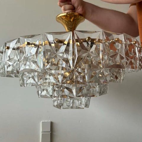 Vintage pendellampe fra 1970'erne, med messingfarvet stel og tonede glaspaneler.