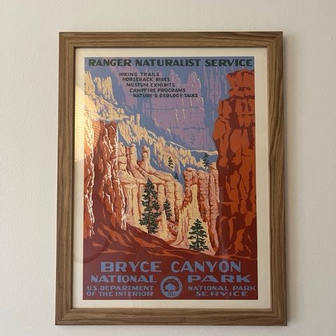 Panorama billede af Grand Canyon som vægdekoration. Billedet er indrammet og viser et bredt udsyn over Grand Canyon med klippeformationer og en klar himmel. Velegnet til ophængning i hjem eller kontor som dekorativt element. 99x39