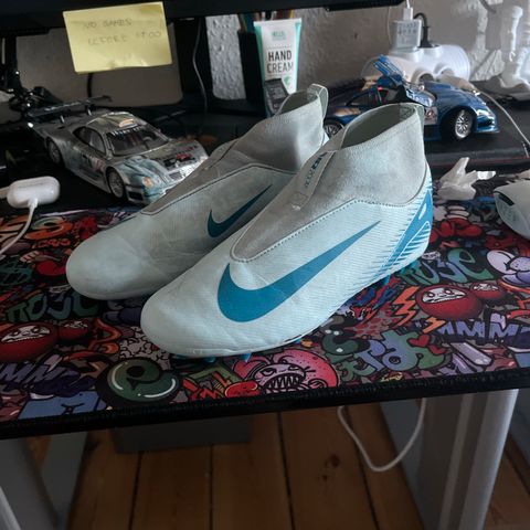 Nike Air Zoom fodboldsko i hvid og blå med en høj ankelkrave for støtte.