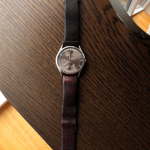 Flot herreur i mørkt stål med kobberfarvede tidsmarkeringer og viser