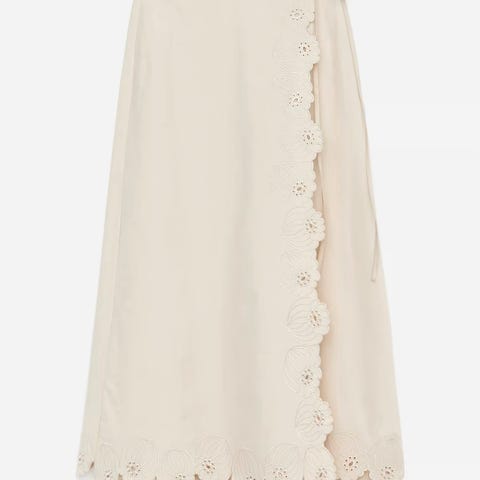 Klokkeformet, koksgrå, lynlås i siden. Livvidde 68cm, længde 41cm. Mat: uld, viscose, polyester.