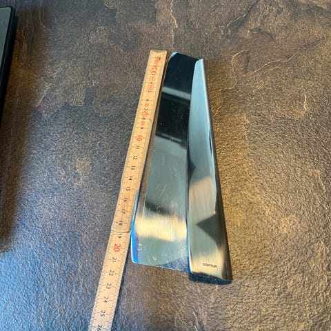 Stelton Slice & Service Pizzaskærer i rustfrit stål med målene L 22,5 cm x B 8,5 cm x H 4 cm søger et nyt hjem, da den ikke får lov at komme i aktion i dens nuværende hjem. Pizzaskæreren er udgået af produktion, så hvis den står på din ønskeliste, har du her en unik mulighed for at erhverve en, som er i god stand. Pizzaskæreren kan afhentes i Brønshøj. Se også mine andre Stelton annoncer.