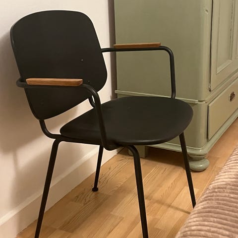 Brugt sort og mørk træ farve stol med synlige brugsspor