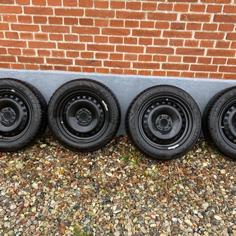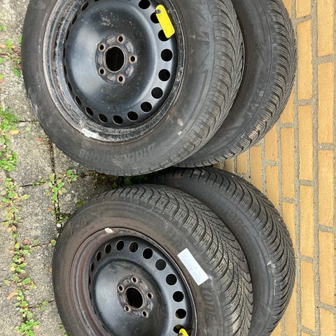 Finde alufælge fra Ford med Goodyear vinterdæk. Ca. 4 mm mønster tilbage. Har siddet på en Ford Focus 4 gen.