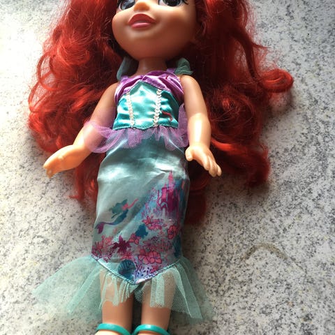 Disney Ariel Havfrue Dukke med rød hår og blå glitrende hale. Dukken har detaljer som en lilla top med muslingeskalmotiv og store blå øjne. Egnet som legetøj til børn.