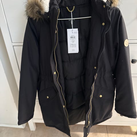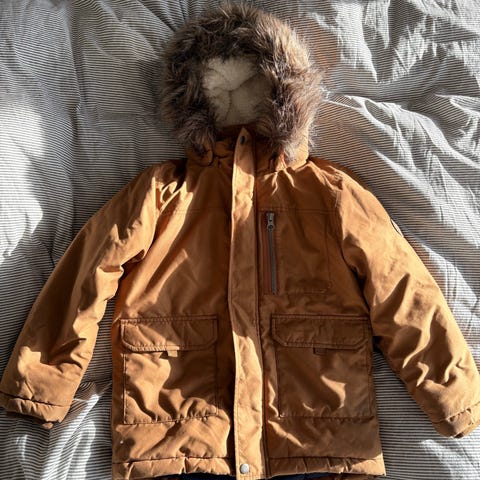 Ingen huller eller pletter, og ikke slidt ved hænderne. Lynlås virker og hætten kan tages af.