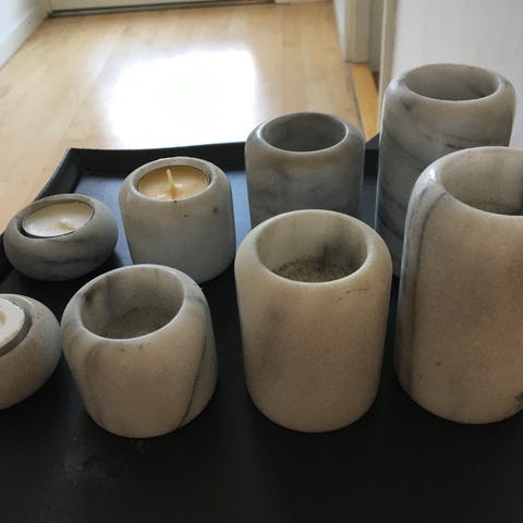 Marmor lysestager hvid/grå 2.stk. dia. 5.cm. høj 4.cm. 1.stk. dia. 4,5cm. højde 4,5cm. 1.stk. dia. 4,5cm. højde 7.cm. Sælger 4. stk. for 60kr.