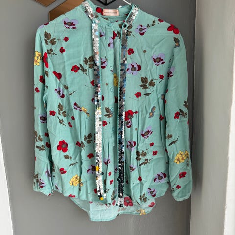 Lavet i funky stof til sommeren med anderledes ærmer og en fin krave. Forskellige knapper.