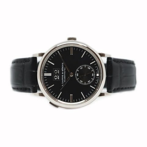 A. Lange & Söhne, i 18K hvidguld og 38.5mm. Sølv farvet skive og med det karakteristiske 'out side' datovindue som Lange & Söhne er kendt for. Endvidere har skiven på gangreserve indikator og sub-seconds.