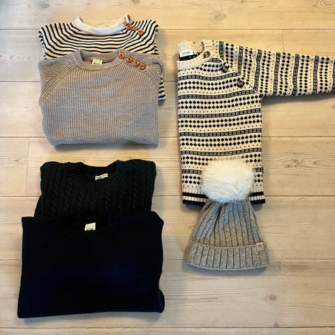 Lækker FUB strik i cremefarvet med marine og røde tern i dansk design. Str. 130 og i 100 % økologisk bomuld. Rib kant i hals, ved ærmer og i bund.