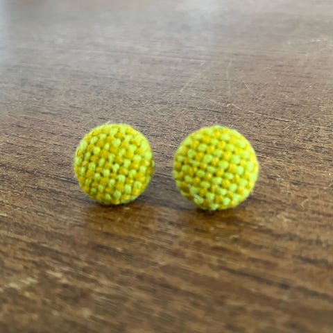 Flotte blå ørestikkere med sorte streger, som er lavet af møbelknapper/overtrukket knapper. De er købt i en designbutik på Stefansgade på Nørrebro og er kun anvendt få gange. Jeg kender ikke materialet på selve ørestikkeren.