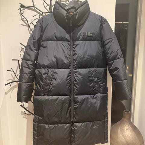 Lækker varm og lang sort dynefrakke i str. 11-14 år