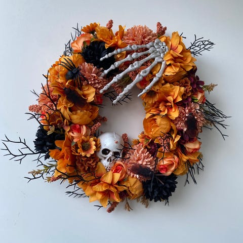 Ø 40 cm. Stor halloween krans, bundet af kunstige blomster. Med "øje" til ophæng.