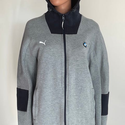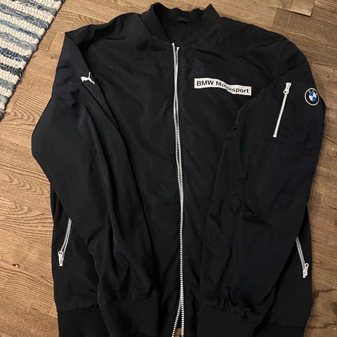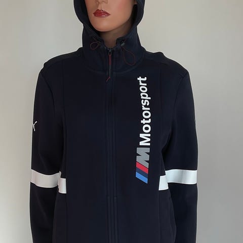 Puma BMW Motorsport jakke i blå farve, størrelse M. Jakken er designet til mænd og har en quiltet konstruktion med lynlåslommer og hætte. Materialet er egnet til udendørs brug og giver beskyttelse mod vind og kulde.