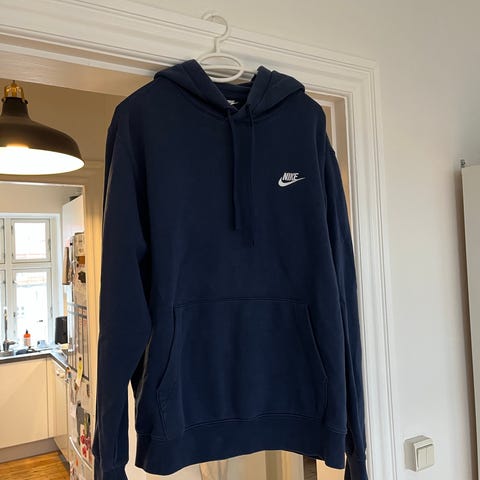 Nike unisex hættetrøje i størrelse M. Trøjen er grå med sort Nike-logo på fronten. Den har lynlås foran og snore i hætten. Materialet er blødt og velegnet til sport og fritid. Ikke ryger hjem og aldrig tørretumblet