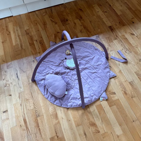 Done by Deer Baby Legetæppe i beige farve. Legetæppet er polstret og har en blød overflade, egnet til spædbørn og småbørn. Materialet er certificeret med OEKO-TEX Standard 100, hvilket sikrer fravær af skadelige stoffer. Designet inkluderer en bøjle til ophæng af legetøj og kan bruges til leg og afslapning.