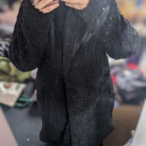 Teddyjakke inspireret af Max Mara-design fra Smoke Furs. Størrelse S, en lille smule oversize - med plads til en sweater under, hvis det er nødvendigt. Kan afhentes på Frederiksberg.