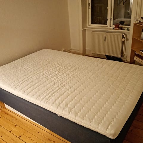 Sengestel fra IKEA, boksmadrasser (2) samt topmadras fra Jysk.