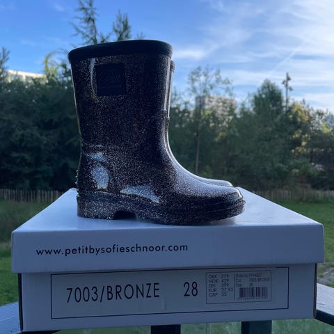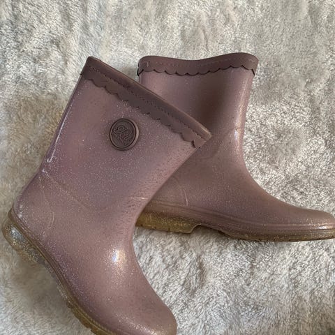 Petit by Sofie Schnoor Børne Gummistøvler i størrelse 35. Støvlerne er rosa med glimmer og har en blød, foret inderside. Materialet er vandtæt gummi, egnet til børn, pige.
