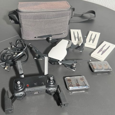 DJI Mavic Pro drone. Inkluderer fjernbetjening, batteri, oplader og tilbehør opbevaret i en transportkuffert.